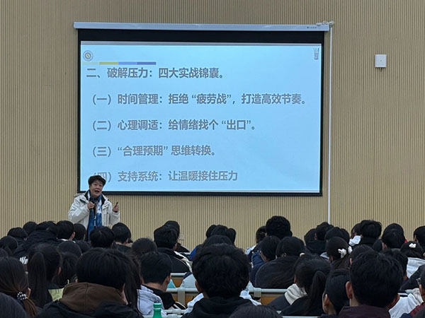 讲座伊始,余老师并未直接给出减压技巧,而是首先引导同学们重新认识压力。“当我们把压力视为敌人时,它的每一次出现都会让我们如临大敌。”余老师通过生动的比喻和常见的备考场景,帮助同学们认识到压力并非全然负面,适度的压力其实是专注和动力的来源,是身体为重要事件所做的准备。这一认知的转变,让同学们放下了对压力的抗拒和焦虑,开始以更客观、平和的心态看待自身当下的情绪状态,为后续的减压实践奠定了坚实的心理基础。