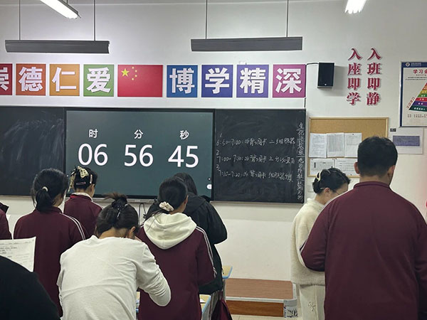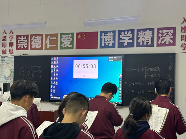 为确保早读质量,年级组统筹规划,制定详细实施方案。每天清晨,任课教师均提前到岗,认真准备早读内容,规范板书设计:明确早读任务、细化背诵条目、合理分配每个知识点的背诵时间,做到目标清晰、条理分明。同时,巧妙借助多媒体设备,设置倒计时钟进行动态播放,以时间管理倒逼效率提升,帮助学生形成紧迫感与专注力,让每一分钟都掷地有声。
